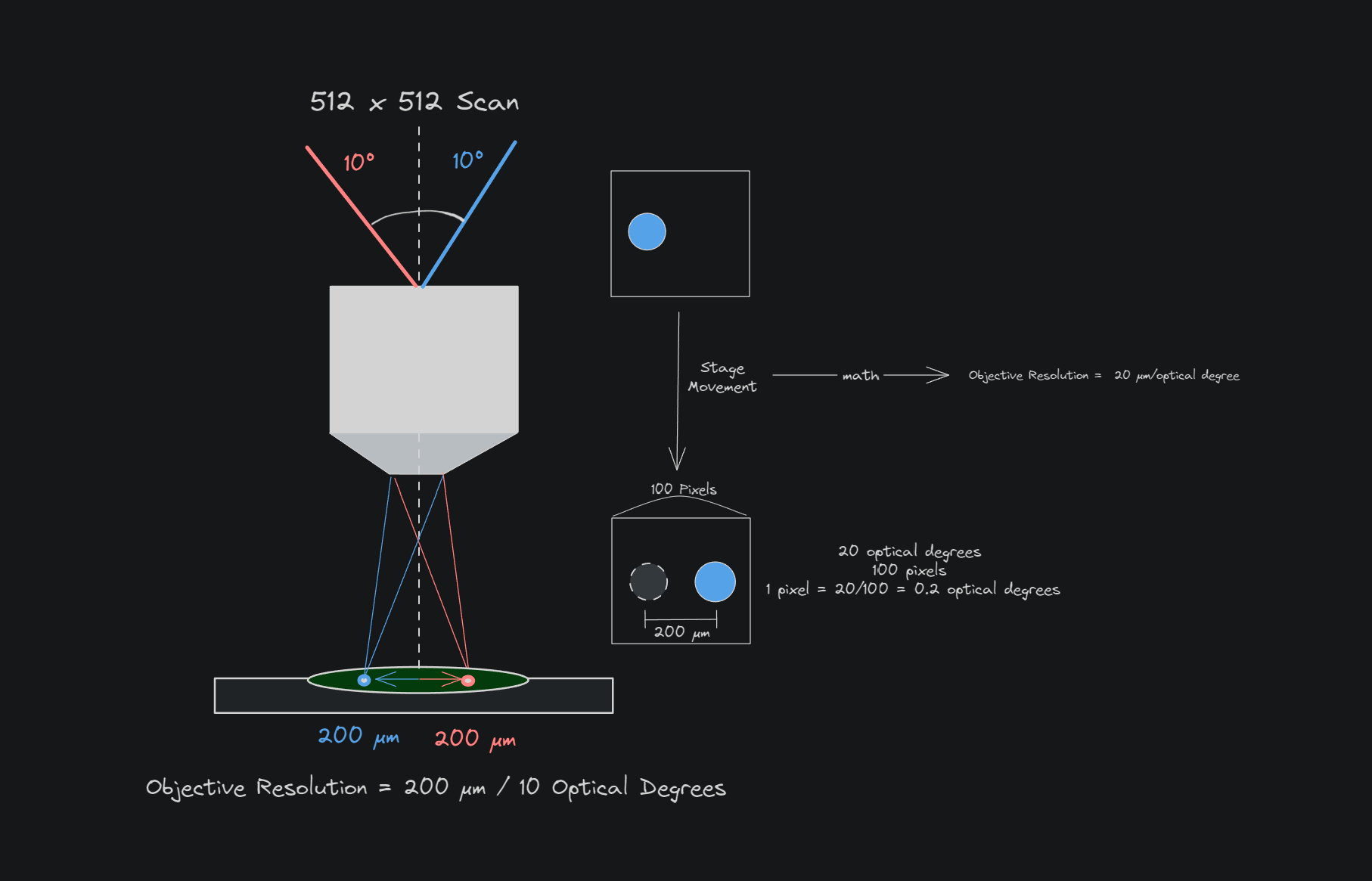 A ratio of the linear distance (in microns) between pixel positions after stage movement divided by the optical degrees for movement based off the ScanField.