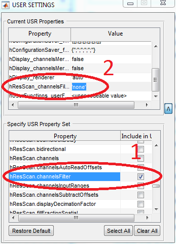 Locate the setting hSI.hResScan.channelsFilter in the list ‘Current USR Properties’ and change the value to ‘none’