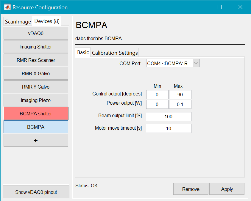 Once the shutter and motorized half-wave plate device have Ready status, you can pair them with your Imaging Scanner in the ScanImage tab.