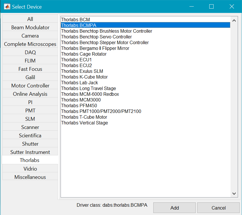 Select the category ‘Thorlabs’, and select BCM-PA. This is simply for