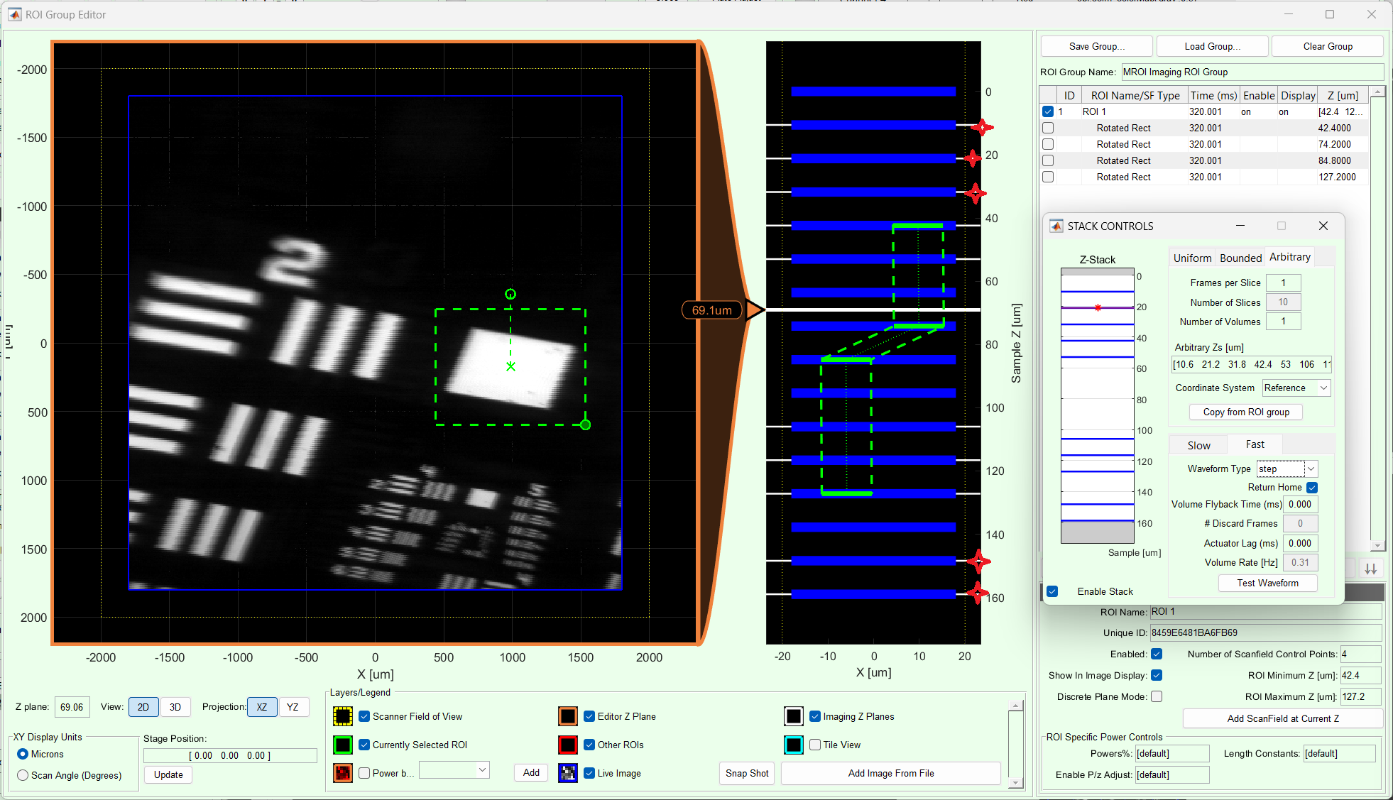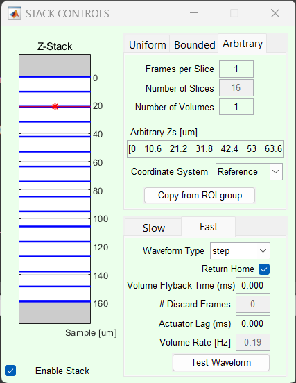 When defining a stack, the arbitrary stack definition should be used with the coordinate system set to Reference. This selection will allow the user to define the stack in terms of the range of the fastZ device ignoring the current sample position. When the liquid crystal fastZ is configured, the Zs that can be used will be loaded as arbitrary Zs automatically, so you only need to remove the (up to 15) planes that you do not want to acquire.