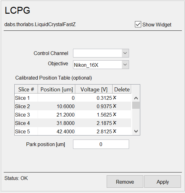 From the Resource Configuration window, click the + button. Select Fast Focus from the sidebar, and select the Thorlabs Liquid Crystal Analog FastZ device from the list of devices. Click Add.