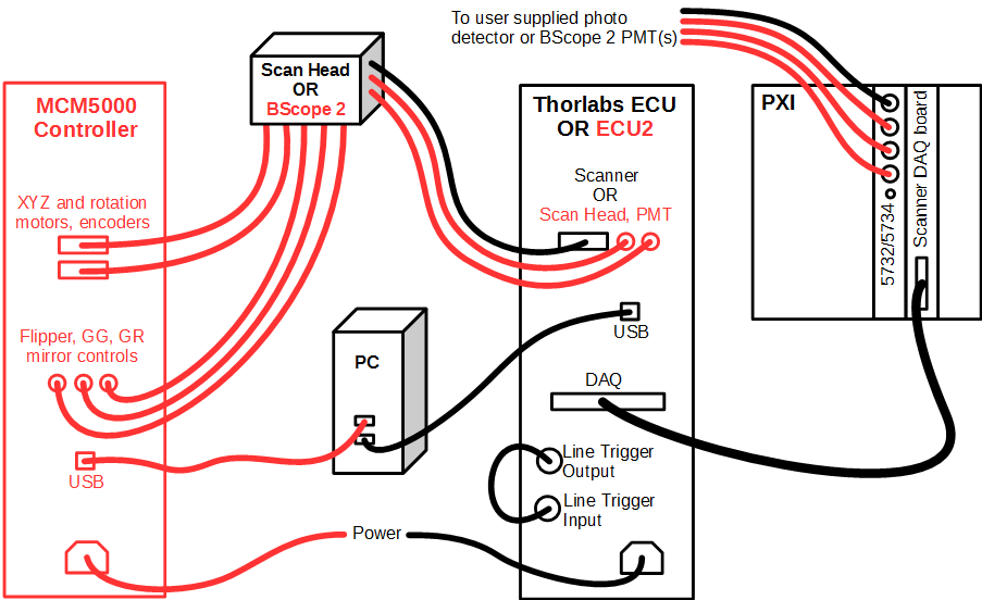 The Thorlabs ECU a is controller box which is used as part of the BScope. The ECU1 is capable of controlling a resonant-galvo scanhead, and 2 PMTs