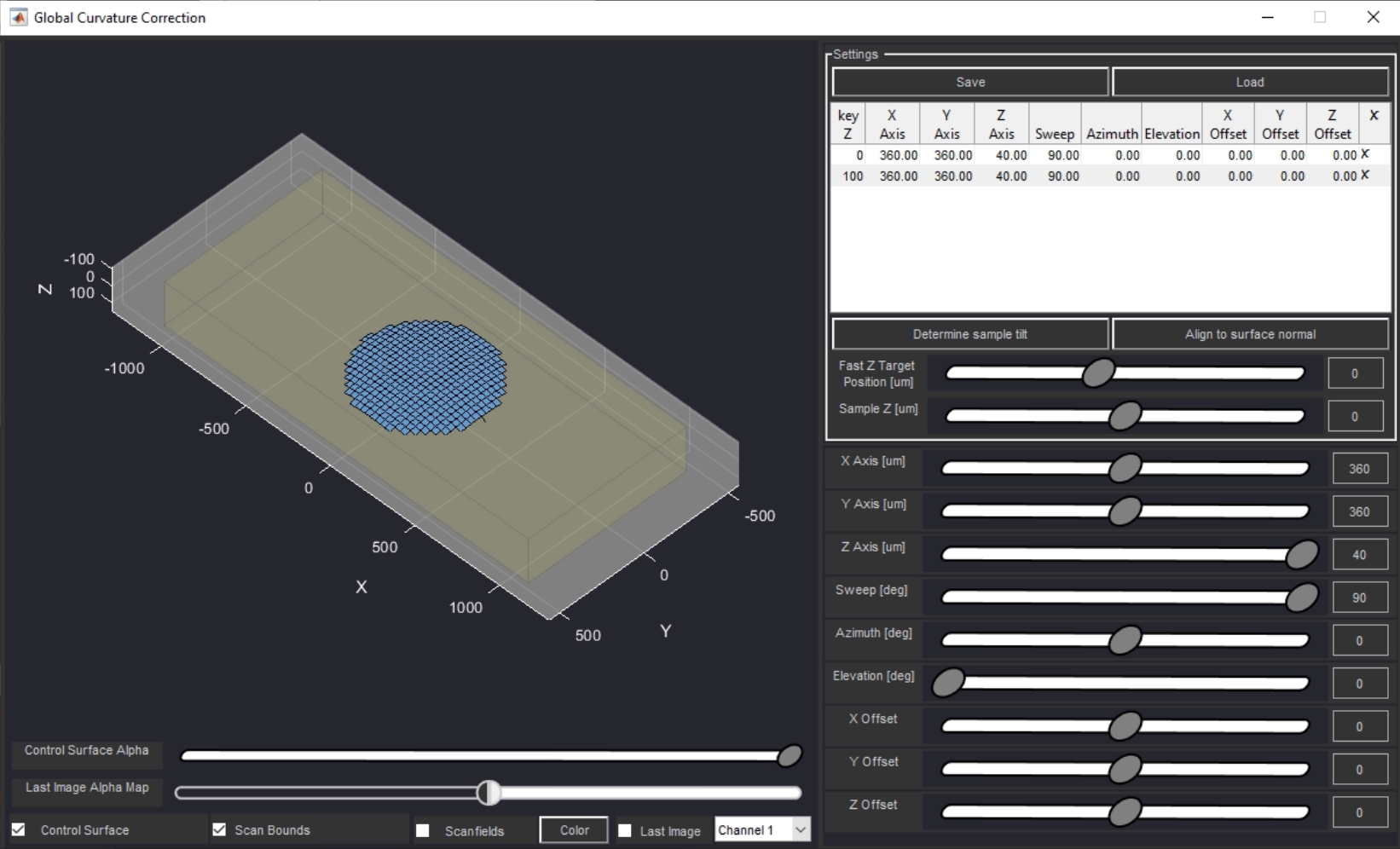 For each fastZ position that a planar acquisition or stack acquisition slice can be made, we aim to shape the curvature of that plane or slice uniquely with this GUI. Given that fastZ actuators are typically driven by analog waveforms, that means that there is a continuum of fastZ positions in the range of the actuator. Thus, one can define the curvature at several key fastZ positions, and then for any fastZ positions not defined, the curvature settings from key Zs are interpolated to define the curvature at intermediate planes. Planes outside the bounds of defined Zs simply use the curvature settings at the nearest bound.