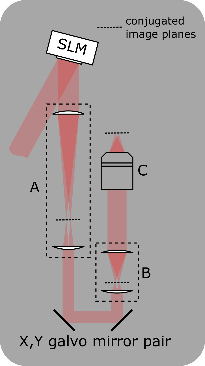 ScanImage’s photostimulation module supports simultaneous multi-site stimulation by utilizing a phase-only SLM for wavefront shaping. Since the SLM update rate and the achievable scan angle of the SLM are limited, the SLM can be used in series with two galvanometer mirrors, which allow to scan the projected dots over the sample.