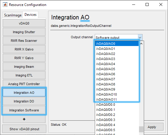 To configure output channels, open the Resource Configuration Editor and locate the Integration ROI Output Channel under section Online Analysis. Name the device such that it indicates the type of output it will generate. In this example, they are named “Integration AO”, “Integration DO”, and “Integration Software” for each of the output types.