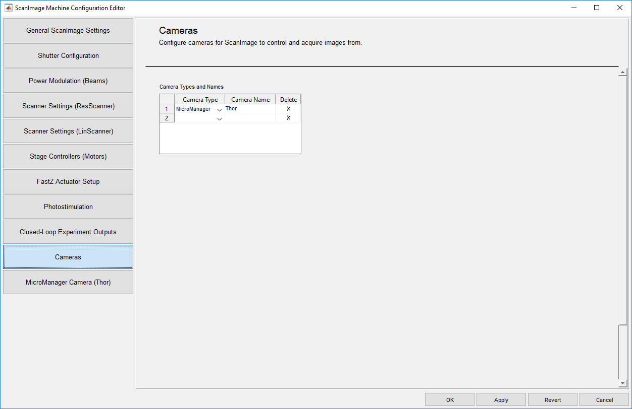 Cameras are configurable from the Machine Data File Cameras Tab. The table contains a drop down menu to select cameras based on their type from a list of supported cameras or camera drivers, as well as a field to name the camera.