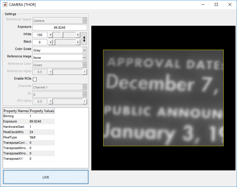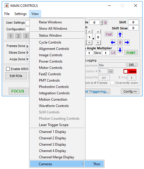 Cameras, once configured, are available from the Main Controls window of ScanImage® under View->Cameras and are listed by name as entered in the MDF. The previously configured µManager ThorLabs camera is listed as Thor. Clicking on this will launch the camera control interface window for the selected camera.