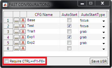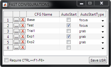 AutoStartType: One of focus, grab, or loop. If AutoStart? is checked, this mode will be activated when a specific Fast Configuration is loaded.