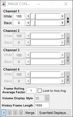 For each channel, these specify input digitizer levels that are displayed as full and zero brightness (i.e. white and black, for standard grayscale colormap) on the Channel display figures. The button on the left can be used to automatically adjust the contrast levels based on the image currently in the channel window.