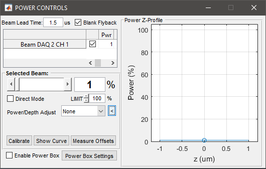The command signal generated by ScanImage® for selected Beam will alternate between the specified Power level and the minimum power (during scanner flyback or turnaround)