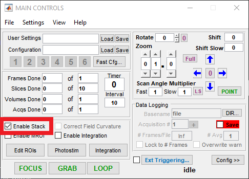 The ‘Enable Stack’ checkbox in the main controls window activates stack acquisition for Grab or Loop acquisitions