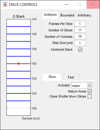 The Stack Controls window allows to define stack acquisition. ScanImage supports multiple modes of defining and executing stacks:
