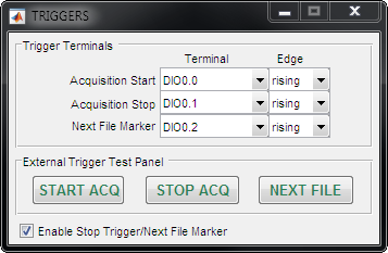 The External Trigger Test Panel buttons can only be used if External Triggering is enabled in the Main Controls Window.