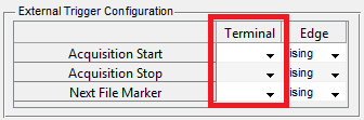 Assign a role to an external trigger. See Acquisition Triggering for a description of each role. This is the physical terminal to which your trigger signal is attached. Icon Each physical terminal can be connected to one or more trigger functions. |