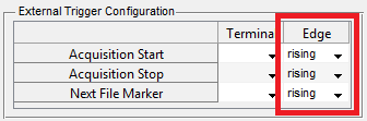 Configure the input terminal to expect either a rising or falling TTL transition. The edge on which the trigger signal generates the selected trigger function. Icon A trigger function can be assigned to the rising edge and falling edges of a single physical terminal. |